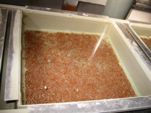 Die Forelleneier werden mit dem männlichen Samen vermischt und in die selbstgebaute Brutanlage eingebracht. Jährlich erbrüten wir ca. 60.000 Eier.