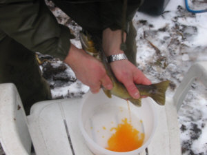 Anschliessend werden die männlichen und weiblichen Forellen/Äschen abgestreift.