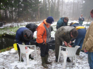 Mit Hilfe von Elektrofischgeräten werden laichfähige Bachforellen u. Äschen dem hiesigen Bachsystem entnommen. Außerdem werden dadurch Bestandskontrollen durchgeführt.